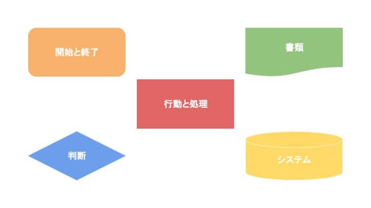 業務フローを作成する時は一つ一つのプロセスに作業図形を当てはめていくわけですが、これには一つ一つ意味があります。ちなみに一般的な作業図形の意味は以下の通りです。